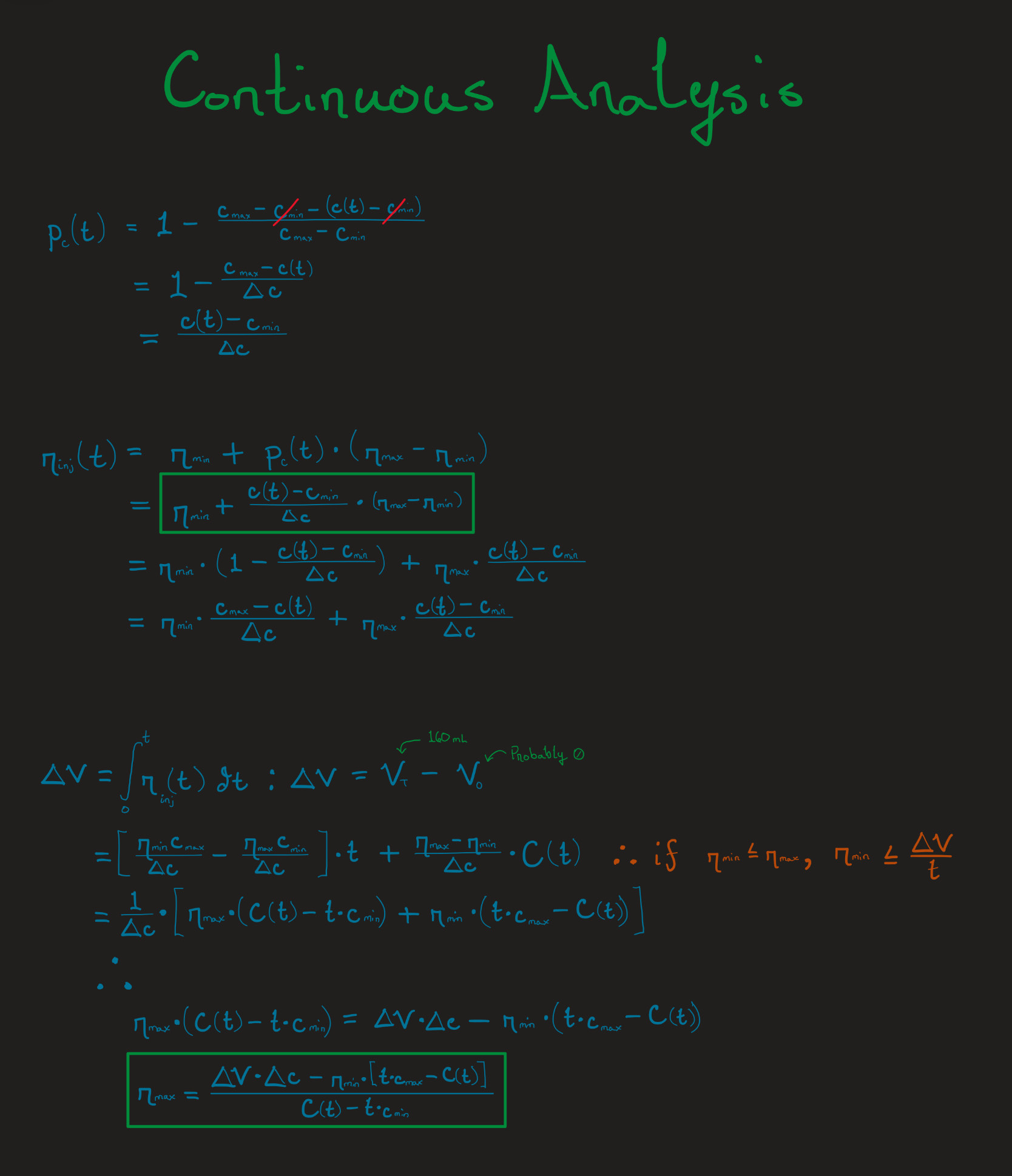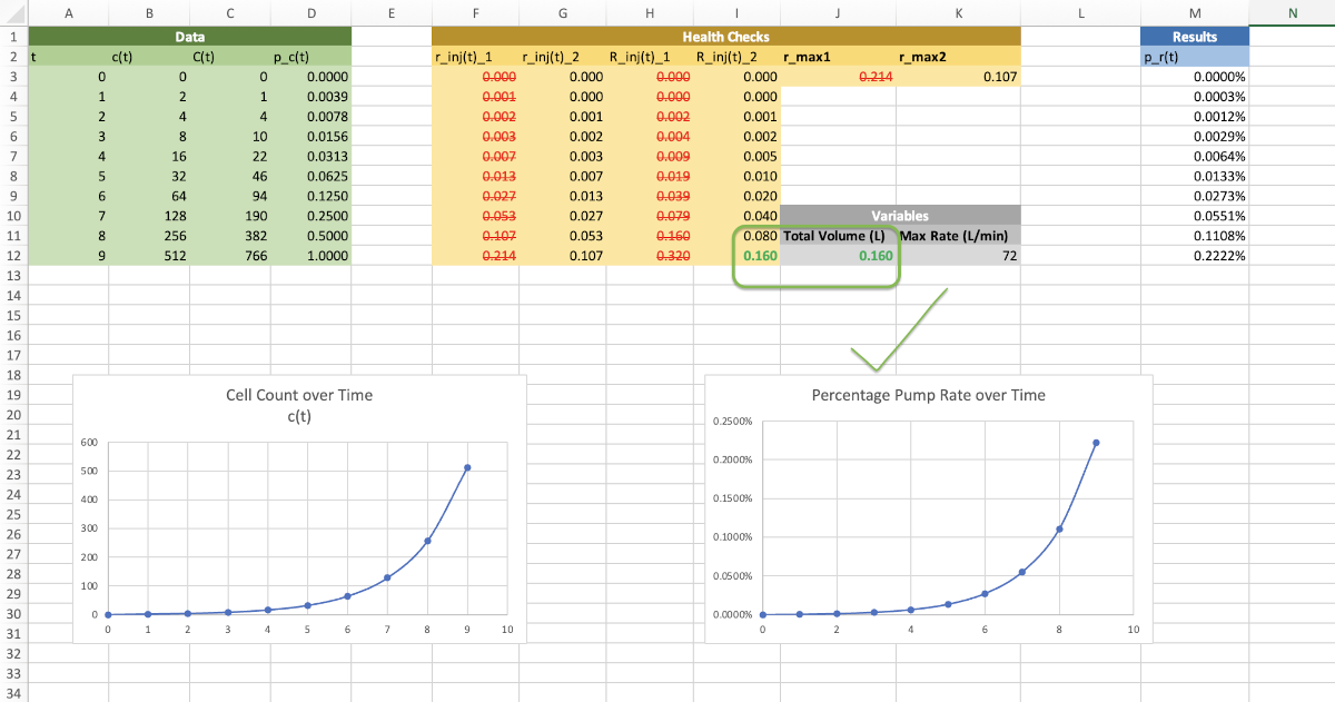 Elementary, Watson! Of course, my later assumptions included that there was a starting amount of cells greater than 1, a minimum feeding rate, and a starting volume of food. This led to having several equations with which I could solve for both a minimum feeding rate as well as a maximum feeding rate. This allowed me to create a discreet model that I plugged into an Excel sheet to provide programmable rates for the machine and sanity checks on final calculations. I hope he gets to use it at his company some day!