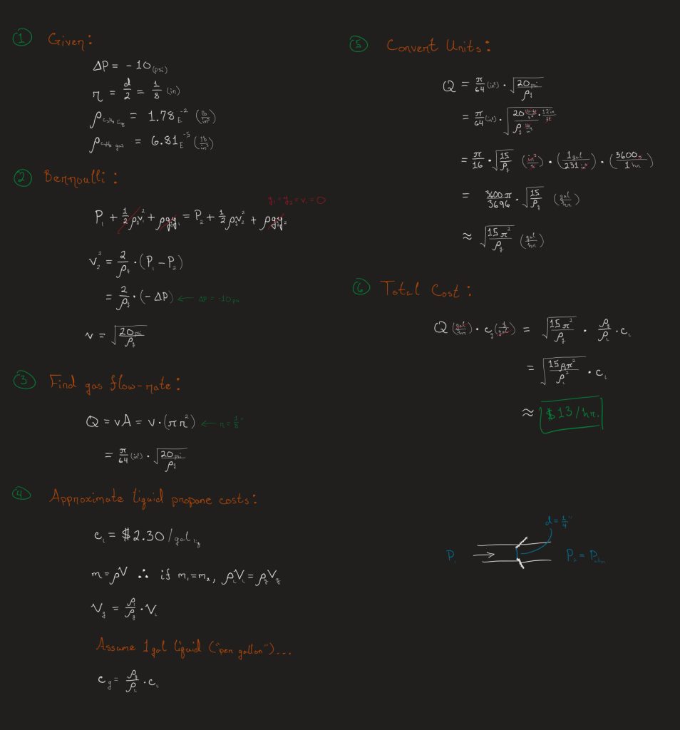 This is just a silly problem one of my friends — a blacksmith — had once on Facebook. The question posed to the world was fairly simple in prose: “If I have a quarter inch pipe and I am running 10psi of propane through it, how much will that cost per hour?” At the time, I had recently completed my first physics and chemistry courses, so I was eager to provide a solution with my newfound understanding of Bernoulli’s equation and dimensional analysis. Fortunately, the equation simplified out nicely, as the gas in the tank had no velocity, and the potential energy from the force of gravity was negligible. Solving for the velocity of the gas leaving pipe, a Google search on the price of liquid propane, and a few conversions later I gave him the answer of ≈$13/hr. He didn’t end up using the system he was designing, but I heard from others that the answer sounded about right. It’s nothing important to my life, but it serves as a reminder to me of the importance of critical thinking and comprehension. I wonder if I got it close to the correct answer. 🙃