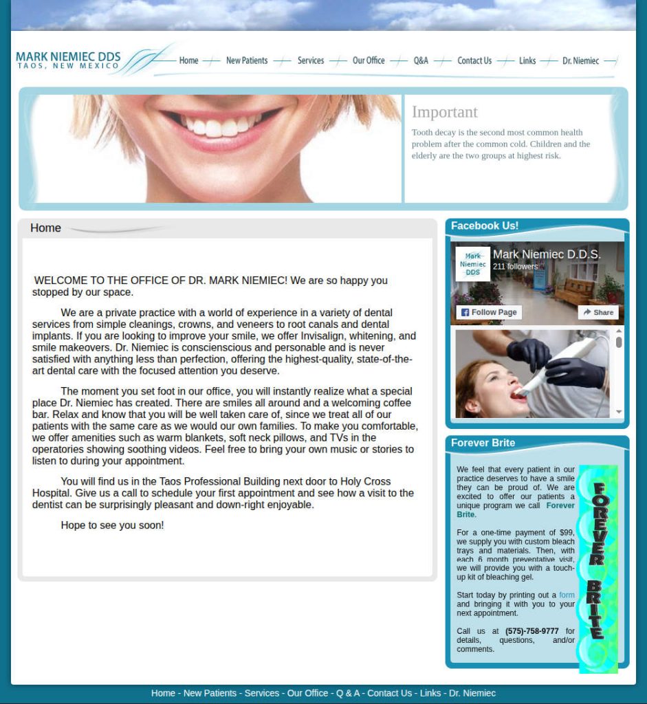 This was one of my very early projects in web design, but a great learning experience. The original design was poorly done by a company in a graphics editor, and a year or two later in browser updates, the site was falling apart at the borders. In addition, the animated graphics on the home page had been created using Adobe Flash (you remember? yeah, you remember!) which was already advised against use and would be deprecated a few short years later. In addition, adding images to the slide was complex and the values could only be changed by directly querying the database. As an additional challenge, my dad’s office held a yearly event where they would rent out the local movie theater and would allow the patients to vote on which upcoming movie they wanted to see. They wanted this to be available on the site along with their new Facebook feed, but it was not possible because the layout was hard-coded with images. Along came ambitious me, and I offered to redo their website. Using the existing theme and layout, I converted everything to a cohesive HTML body that was easily extensible with additional pages and elements. In addition, I recreated their custom Flash slider using the HTML Canvas API, which made things ultra smooth and still looks good today. The cherry on top was the miniature CMS I designed in PHP for them which allowed them to edit page content, modify the slider carousel, and enable a movie-voting feature. I’m sure I could do a much better job today, some 15 years later down the road, but it has held the test of time and shows my lifelong dedication to learning new skills to provide the best possible work that I am able to.