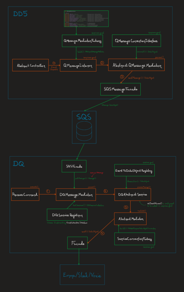 As an almost-in-between step for the microservice development transition and being able to adequately begin development on the SMS project I had elected to spearhead, I took a look towards the aging code Data Dawg currently interacted with an existing microservice system with for posting SQS messages in AWS to send to Emma — the company’s chosen email marketing system. It was my intent to mimic the same patterns and verbiage used in the code so that the integration into Data Dawg would work out-of-the-box with the existing event handler system. A few weeks of note taking yielded a wonderful diagram describing what could be designed as a reusable system for sending API requests. This proved to be a useful teaching tool for the team across several R&D sessions where I was able to shed a lot of light on internals of the system which had lost their original development knowledge and had spent a few years untouched for fear of breaking something. I developed out what was called the “QMessage” library (named after the Q in SQS) which could be included in microservices projects by simply using Composer. The company agreed to fund the use Private Packagist to distribute library updates, which worked very will with the Bitbucket pipelines we had set up for CI/CD. Though I never had the opportunity to upgrade the original system the library was named after, it was a crucial tool in developing the Voxie microservice.